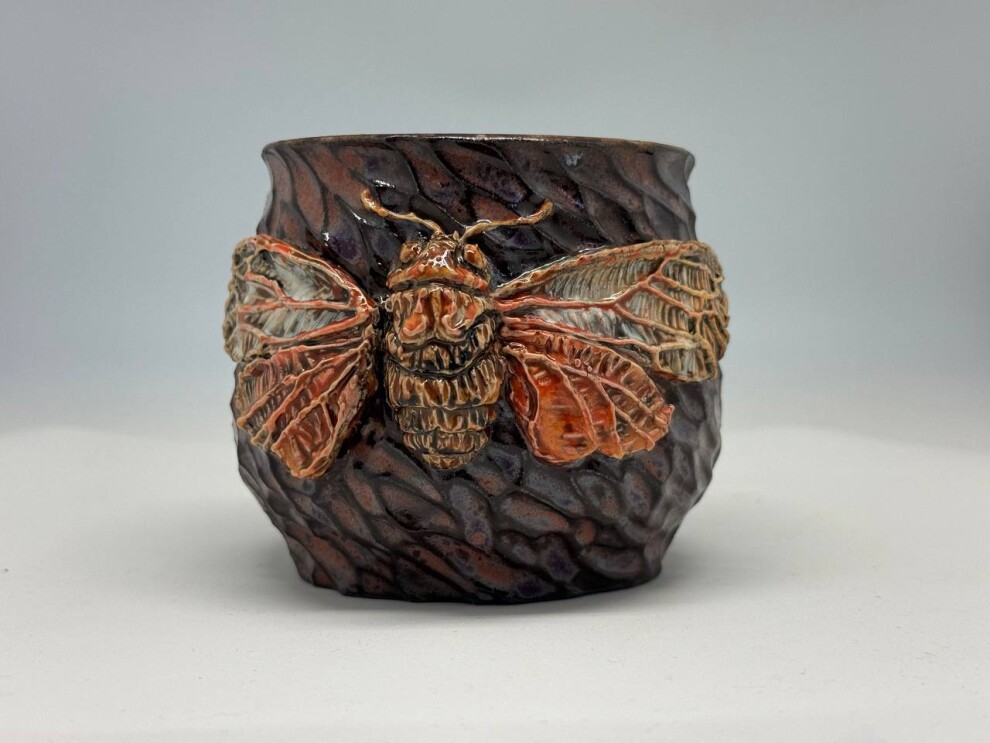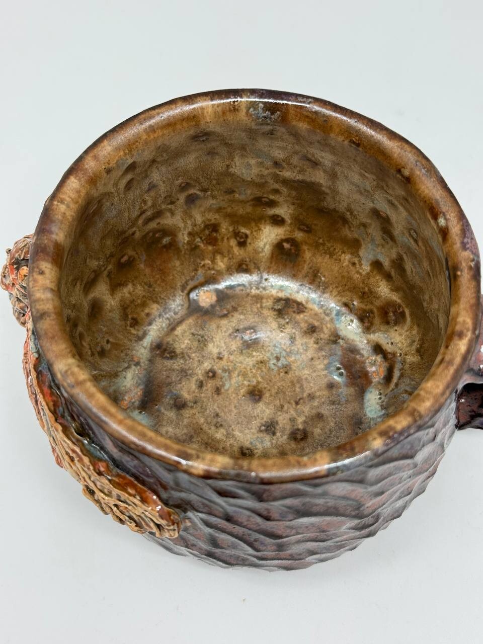 Объём - 600мл, выполнена из немецкой высоко температурной глины и покрыта пищевыми безопасными глазурями, прошла высокий обжиг. Можно мыть в посудомоечной машине и использовать в микроволновке. Полностью ручная работа