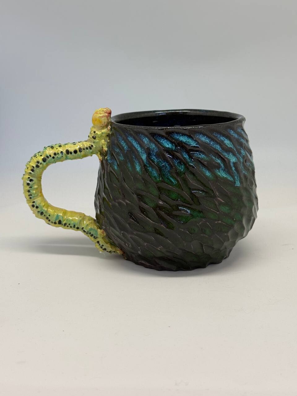 Объём - 550мл, выполнена из немецкой высоко температурной глины и покрыта пищевыми безопасными глазурями, прошла высокий обжиг. Можно мыть в посудомоечной машине и использовать в микроволновке. Полностью ручная работа
