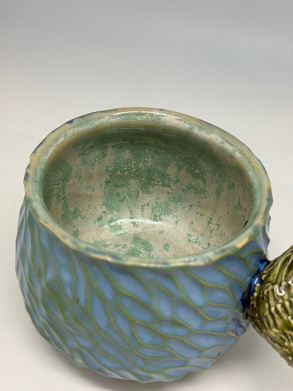 Объём - 350мл, выполнена из немецкой высоко температурной глины и покрыта пищевыми безопасными глазурями, прошла высокий обжиг. Можно мыть в посудомоечной машине и использовать в микроволновке. Полностью ручная работа